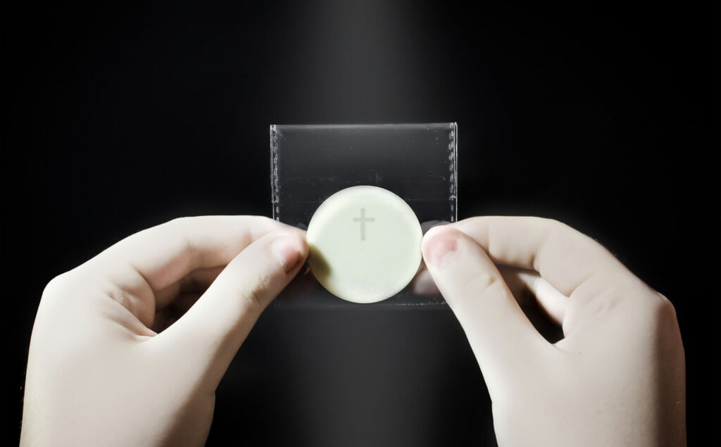 The sachet has an adhesive on the top so that when folded it adheres to the back. When open it has a rectangular shape of 7 cm wide and 10 cm high; when closed it takes on a square shape of 7 x 7 cm. On the inside, however, the particle has a circular shape of 4 x 4 cm. The fact that the sachet is transparent ensures that the host can be seen from the outside, but it also ensures that this protection is not intrusive and is perceived as little as possible so that the communion does not lose its value.